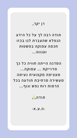 18:30-19:30: שאלות וחוויות, סיכום ופרידה.